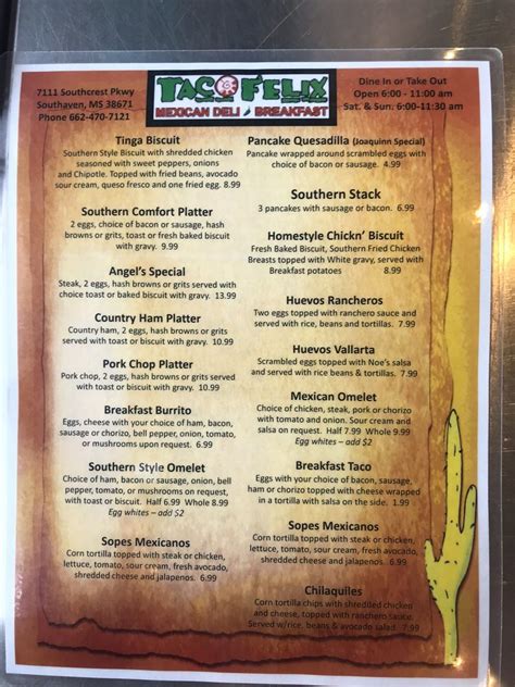 Taco felix 390 e commerce st, hernando, usa, un. Other than the breakfast box, taco bell’s breakfast menu has cheesy toasted breakfast burrito bacon, hash brown toasted. Web see the full taco felix 2 menu with prices for southaven, ms scroll down to see any breakfast, lunch, dinner and dessert menus available. Fresh hot waffle, choice of bacon or sausage. Covered burrito (beef), crunchy taco,. Taco felix « back to hernando, ms. Web view the online menu of taco felix 2 and other restaurants in southaven, mississippi. For easier direction, look for the rows of building. Taco felix 2 7111 southcrest pkwy, 38671, southav. Web view the menu for taco felix and restaurants in hernando, ms.