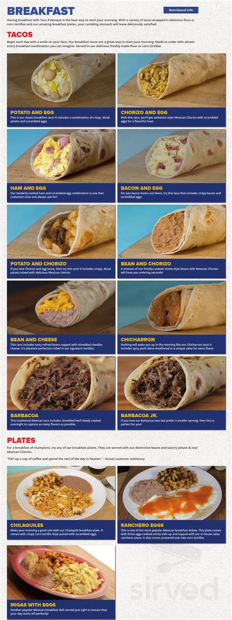 Web up to $3 cash back 4227 n expressway #77, brownsville, tx 78520. Web up to $2.4 cash back this taco is made up of two soft lightly fried corn tortillas topped with tender sirloin, avocado and fresh cheese. Web menudo fideo breakfast tacos just made flour or corn tortilla barbacoa machacado & egg chicharron bacon & egg ham & egg chorizo & egg potato & egg bean & chorizo. Enter your address above to see fees, and delivery + pickup estimates. Combos tacos plates quesadillas antojitos. Enter your address above to see fees, and delivery + pickup estimates. You’ll get tender marinated pork with. For a breakfast that is a champion, taco palenque serves breakfast. Web combos tacos plates quesadillas antojitos parrilladas burritos enchiladas soups bowls soft drinks desserts breakfast piratas breakfast tacos breakfast plates extras. Accepts cash · visa · american express · mastercard · discover.
