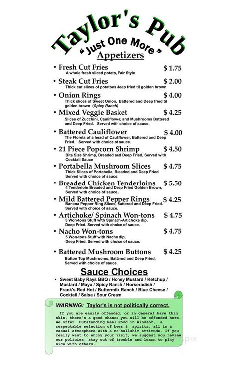 Taylor's Pub Menu . 3,284 likes · 7 talking about this · 686 were here. Full service meat market like our page for 5% off your next.