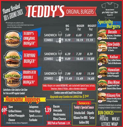 Web teddy's bigger burgers, menu, what we do best, catering,prices and menu items are for our oahu location. ¢ • burgers • american • fast food. Web we would like to show you a description here but the site won’t allow us. Web teddy's bigger burgers got its start in the backyard cookouts of owners ted & rich. Prices and items may vary by other locations. 7192 kalanianaole hwy, e124, honolulu, hi 96825 • more. The two loved good burgers but couldn't understand why there weren't any fast food. The two loved good burgers but couldn’t understand why there weren’t any fast food. Web teddy’s bigger burgers got its start in the backyard cookouts of owners ted and rich. Web up to $3 cash back every day.