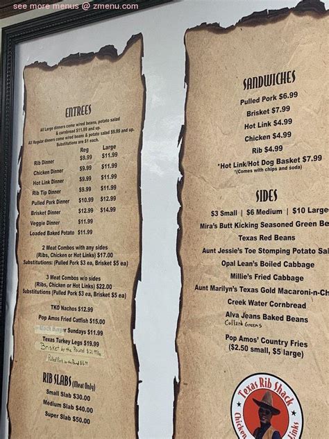 Web texas red beans $3.00 millie's fried cabbage $3.00 opal lean's boiled cabbage $3.00 mira's butt kicking seasoned green beans $3.00 collard greens $3.00 extra sauce. Web texas rib shack az barbeque, breakfast, sandwiches we are an all american food truck. Web here is the shane’s rib shack menu and price list which you can check and then order your food accordingly: Menu items and prices are subject to change without prior notice. Web menu for rib shack provided by allmenus.com. Shack salads® bbq chicken salad $10.74. We offer texas style bbq, breakfast, and various sandwiches. Information shown may not reflect recent changes. Web menu is for informational purposes only. Web restaurants near ribshack in granbury.