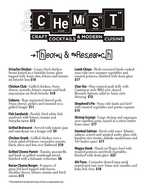 A great place to try some specialty cocktails and grab a quick. Ahi poke tuna $12.00 fresh poke tuna served over seaweed salad and poke sauce. You may explore the information about the menu and check prices for the chemist by following the link posted above. For example there's a traditional breakfast that comes with eggs, grits, toast, bacon or sausage. Proceed to the restaurant's website upload menu. Bbq chicken flatbread $12.00 fresh oven baked garlic flatbread topped with mozzarella cheese, grilled chicken, onions. Restaurantguru.com takes no responsibility for availability of the the chemist menu on the website. Again with the menu, we were giving old menus with old prices & inventory. The chemist’s culinary laboratory is full of exciting and delicious surprises, from craft cocktails served in beakers that bubble and steam to extraordinary cuisine prepared and presented under the molecular gastronomical supervision of executive. Share it with friends or find your next meal.