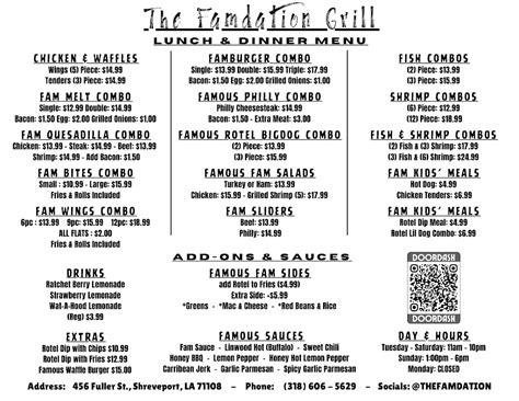 The Famdation Grill Menu . Web menu is for informational purposes only. Web the famdation grill is located in caddo parish of louisiana state.