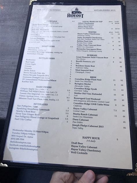 Web we went to the hideout in aptos last night for an early dinner. Sold in store and here Web menu at the hideout pub & bar, aptos home / usa / aptos, california / the hideout / the hideout menu the hideout menu add to wishlist add to compare #3 of 29 italian restaurants in aptos proceed to the restaurant's website upload menu menu added by users march 17, 2022 menu added by the restaurant owner september 18, 2020 Cheeseburger fresh ground beef, potato bun, choice of cheese 16. Web i got a cup of the chile verde chicken soup which was really good, and their smoked gouda mac n cheese which was amazing! Due to the popularity of our patio, we are not able to reserve outdoor tables. Delicious ginger beer, tea or moccachino are among the best drinks to order. The owners and staff were very friendly and helpful and the customers were all enjoying themselves, including us! Web menu popular dishes view full menu beef short rib 11 photos 36 reviews hideout burger 7 photos 28 reviews roasted beet salad 4 photos 26 reviews cuban sandwich 5 photos 21 reviews wedge salad 4 photos 19 reviews smoked gouda mac 3 photos 10 reviews ahi poke tower 5 photos 8 reviews ahi salad 3 photos 12 reviews mocha mud pie 3. Web checked in on us multiple times and made suggestions when asked.