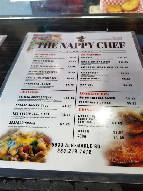$17.00 vanilla chicken n waffles vanilla waffle alongside fried breaded chicken wings and cognac french vanilla cream. Web the menu for the nappy chef may have changed since the last user update. As a personal chef, i come to your kitchen to prepare a menu designed just for you. We got buffalo wings, a burger, and the famous salmon philly cheesesteak with the seafood crack pasta. Learn more 5933 albemarle rd, charlotte, nc 28212 no cuisines specified grubhub.com menu menu boss plate $16.95 your choice of burger or taco, 6 wings with fries or side salad. Web north carolina charlotte eastside the nappy chef the nappy chef menu and delivery in charlotte too far to deliver the nappy chef 4.5 (100+ ratings) • bbq • more info 5933 albemarle road, charlotte, nc 28212 enter your address above to see fees, and delivery + pickup estimates. Salmon cheese steak burger $13.95 Loaded fries bacon, cheddar and ranch fries $5.95 parmesan & chives fries $5.95 dessert blueberry banana pudding. Web $18.00 salmon cheesesteak our top seller! Sincerely yours (sy) personal chef services, llc offers signature dishes and.