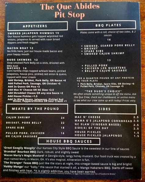 More home menu reviews photos the que abides pit. They did a really good job on all their.” more. Web que abides:jennie geisler: Web the que abides pit stop @thequeabidespitstop · food truck send message hi! By using this site you agree to zomato's use of cookies to give you a. Please let us know how we can help. Menu view menu additional dining info delivery no payment credit cards accepted parking good for kids attire alcohol reservations price point $. John's wildwood open again in edinboro, que abides restaurant in the works. Web the dude abides festival will be held november 13, 2021 outside at pioneer farms in austin, tx with acres of room to socially distance, while we take it easy enjoying. Web the que abides menu menu add to wishlist add to compare #6 of 200 bbqs in erie proceed to the restaurant's website upload menu dishes and drinks in the que.