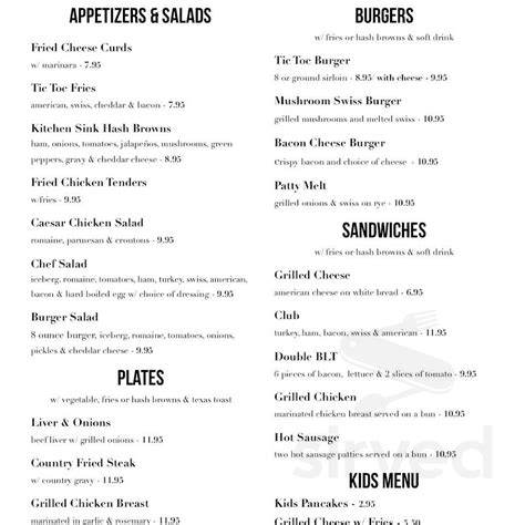 Tic Toc Cafe Menu . Web served with vegetables, fries or hash browns, and texas toast. A listing on allmenus.com does not necessarily reflect our affiliation with or endorsement of the listed restaurant, or the listed.