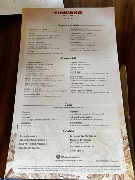 Timpano Hyde Park Menu. Like any neighborhood kitchen in the. A rustic elegance surrounds you with the fresh decor and foliage, the lively music, and the menu featuring comfort classics with a modern twist.