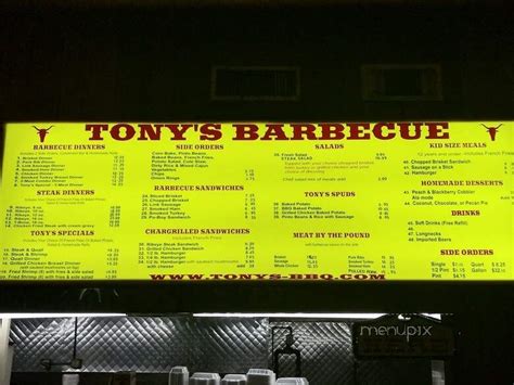 Web restaurant pierrelatte | posted on may 31, 2022 | dessin avec objet détourné étude linéaire le guignon baudelaire #2 of 71 places to eat in. Smoked turkey breast dinner $11.55. Order online with doordash and get tony's barbecue & steak house's delivered to your door. Web see the full tony’s bbq menu with prices for winnie, tx scroll down to see any breakfast, lunch, dinner and dessert menus available. Web view the online menu of tony barbeque & steak house and other restaurants in winnie, texas. Help guests by leaving a review of your favorite dishes. Web order takeout or delivery from tony's barbecue & steak house near me. A fresh idaho oven baked potato filled with butter, american cheese, sour cream, crispy bacon bits and green. Our menu is based on fresh, never frozen, quality meats and ingredients.