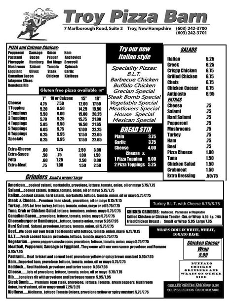 Classic combinations like aged midwestern beef with rich creamed spinach are joined by equally enticing seafood and savory seasoned pork or. With something for everyone, we are. You are free to download the troy pizza barn menu files. Cooked salami, lettuce, tomato, onion, oil or mayo. Web troy pizza barn, troy, new hampshire. We hear their food's delish. The remodeled old barn houses dining and banquet facilities providing a unique country style menu. Our menus feature carefully selected choices to satisfy your taste for delicious, whatever it may be. Web #1 of 3 pizza restaurants in troy proceed to the restaurant's website upload menu menu added by the restaurant owner july 12, 2020 the restaurant information including the troy pizza barn menu items and prices may have been modified since the last website update. Web get first access to new beer releases, events, announcements and more!
