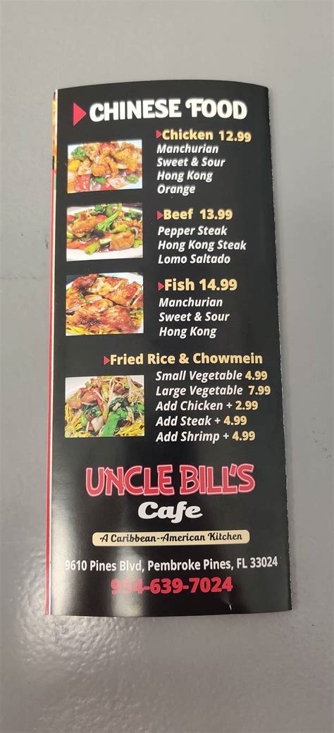 Prices reflect the average cost of dinner for one person, including appetizer, entrée, dessert, coffee, tax and tip. This place is one of the 3 most popular spots for halal delivery in all of pembroke pines. Web reviews for uncle bill's cafe. Here at uncle bill's cafe, in pembroke pines we are passionate about making food that has substance to it, try our appetizing chicken. Our famous cream cheese filling served with homemade cinnamon butter. Wine and other beverages are not included. Served with black beans and cilantro rice, fresh guacamole, sour cream, cheese, pico de gallo, sautéed peppers and onions with our homemade flour tortillas. We're always here to serve you! A collection of delicious coffee is provided to guests. Here you will pay democratic prices.