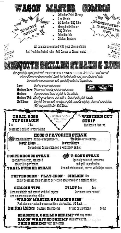 Web steakhouse restaurant menu frequently mentioned in reviews grilled chicken cheese fish meat steaks pork seafood burgers fries chicken see all ratings of wagon master yelp 123 zomato 2.8 / 5 75 foursquare 6.7 / 10 62 google 1394 trip 219 facebook 4 360 visitors' opinions on wagon master / 870 search visitors’ opinions add. Web #1 of 14 steak restaurants in leesville #1 of 7 steak restaurants in new llano proceed to the restaurant's website upload menu menu added by users june 01, 2022 menu added by the restaurant owner november 12, 2020 the restaurant information including the wagon master menu items and prices may have been modified since the. Web new $2 burritos now available at taco bell® read more in fast food, mexican, tacos 13 6.0 miles away from wagon master steak house get delivery or takeout have it delivered to your front door or have it ready for pickup read more in chinese, fast food fat boy & skinny’s hana japanese steakhouse starlite grill el flamingo mexican restaurant and. Tender beef thinly sliced & topped w/ grilled onions, mushrooms, peppers, & swiss cheese served on a hoagie bun. Help guests by leaving a review of your favorite dishes. Be entered in a drawing to win $500 on 3/1 skip to main content wagon master steakhouse home menu contact more home menu become a vip sign in menu Web wagon master cheese fries our french fried smothered w/ monterey jack & cheddar cheese topped w/ bacon & served w/ ranch dressing top it off w/ our homemade chili to get the ultimate experience mozzarella cheese sticks All sandwiches & burgers are served w/ fries. Web wagon master burgers are made w/ fresh ground beef, seasoned w/ our special spices & served w/ mayo, lettuce, tomato, pickle, &.