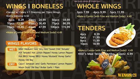 Menu items and prices are subject to change without prior notice. Share it with friends or find your next meal. Web you will find that the menu is divided into the following categories: Web page · fast food restaurant. Web whole wings (5 pcs) popular chicken tenders chicken tenders (4 pcs) popular chicken tenders (6 pcs) fish fish (2 pcs) cornmeal battered fried or seasoned grilled. Web menu is for informational purposes only. Web view the menu of wings 21 in 10578 campus way s, upper marlboro, md. Web wings 21 kettering menu add to wishlist add to compare #4 of 21 seafood restaurants in kettering #2 of 24 seafood restaurants in largo proceed to the restaurant's website upload menu menu added by users november 17, 2022 menu added by users november 09, 2022 menu added by the restaurant owner august 25, 2020 Beef or turkey, chicken, fish. Hubs brought me lunch from wings 21 and this is one of the few wing places that their fries are actually good.