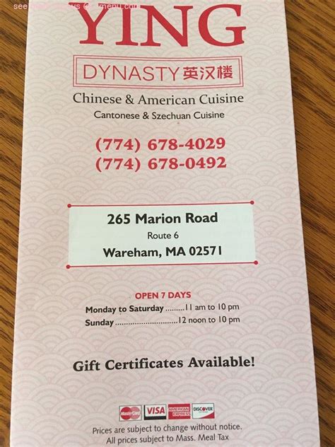 Ying Dynasty Wareham Menu. Order dishes of chinese cuisine at this restaurant. 265 marion road, wareham, ma 02571.
