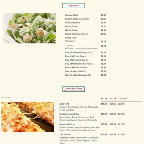 Zuko Pizza Pasta Menu. According to the guests' opinions, waiters serve good cheesecakes, cannolis and tiramisu here. We specialize in new york style pizza as well as many fine italian dishes.